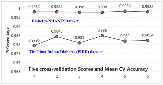 To evaluate the generalization performance of the model on both the Diabetes-NHANES dataset and the Pima Indians Diabetes (PIDD) dataset, a five-fold cross-validation was conducted. For the PIDD, the accuracy scores obtained were [0.9795, 0.9845, 0.981, 0.985, 0.982], resulting in an average accuracy of 98.2%. For the Diabetes-NHANES dataset, the accuracy scores were [0.9982,0.9982,0.9980,0.9980,0.9986], yielding an average accuracy of 99.82%, as shown in Figure 14.