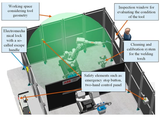 An example of applying the concept of a safety system design based on digital models is illustrated by an original solution for a robotic station (see Figure 3), the operational concept of which is detailed in paper [35]. In this case, the 3D model was used to design the fence system, doors with electromechanical locks, and to plan the layout of safety elements such as emergency stop buttons and station equipment.
