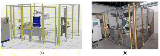 To define a solution as a digital twin, it is necessary to have a two-way exchange of information between the digital model and the physical object. In the case of implementing the algorithms from Figure 5, the digital model will be expanded into a digital twin using a solution for designing and programming robotic stations. Due to the most advanced features and existing experience, the ABB Robot Studio 2020 software was used to create the digital twin (Figure 6). In this software, as well as in most other offline robot programming tools, the most important method of data exchange with the real station is synchronization. This involves transferring programs and data from the real robot controller to the virtual system and vice versa. The arguments presented and the diagram in Figure 6 suggest that the algorithms from Figure 5 enable the creation of accurate station models and their expansion into the concept of digital twins. The research primarily focuses on the geometric mapping of safety systems and potential geometric errors that occur during modeling. The authors emphasize this topic because, based on their experience in programming and designing robotic stations, they consider it the most significant problem and challenge in building such twins. According to established definitions, a digital twin should be characterized by a faithful reproduction of the real object and two-way data exchange. Creating a twin in virtual space using the attributes of a physical entity requires modeling geometric, physical, and behavioral features. The degree of accuracy in modeling individual features depends on the available information about the object and the intended applications of the twin. When designing robotic stations, it is assumed that the physical features of the robot (its geometric and kinematic properties) should be modeled, along with the geometric features of other critical elements, particularly the station’s safety systems. An accurate model of the robot’s kinematics, dynamics, cycle time, etc., is obtained using the virtual controller provided by the robot manufacturer (guaranteed 99% accuracy) and offline simulation software. Thus, the research mainly focuses on the geometric mapping of safety systems.
