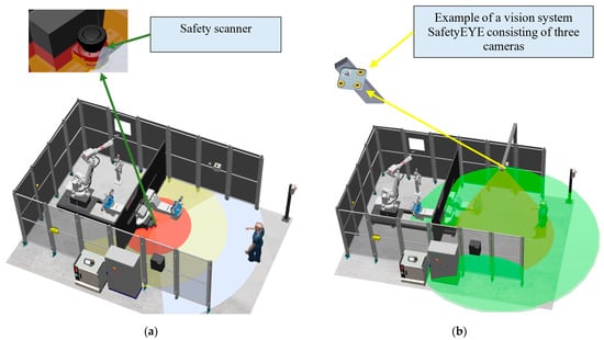 Digital model of the station: (a) with a safety scanner; (b) with a vision safety system.