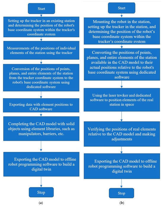 To build an accurate model of a robotic station, an absolute laser tracker and solutions and software (LeicaConnector 1.0) developed as part of the work presented in papers [32,33] can be used. The precise position measurements obtained through the tracker and the dedicated software allow for the rapid and accurate modeling and construction of robotic stations. Figure 5 presents the developed algorithms showing methods for building both an accurate model of the robotic station and a real solution. Two algorithms are proposed due to the variability of the solution. Often, there is a need to construct a digital model of an existing station (Figure 5a). At other times, a real station is built based on its digital model (Figure 5b).