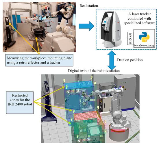 According to the concept illustrated in Figure 8, the laser tracker was used to precisely define restricted zones for the ABB IRB 2400 robot in the digital twin. The coordinates defining each zone were measured using the tracker and retroreflector at the real station, and then converted to coordinates in the robot’s base coordinate system according to the algorithm presented in [36]. After verifying the accuracy of the defined parameters in the station model, the data, along with other settings for each zone, were uploaded to the memory of the real robot controller (communication and synchronization solution, Figure 6). Defining restricted zones in the robot controller ensures that the robot cannot reach these zones both during manual control and while executing programs.
