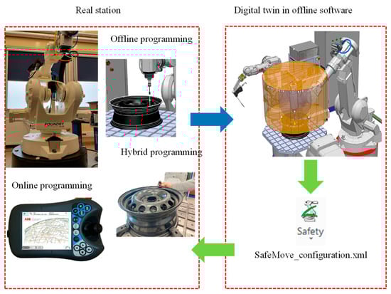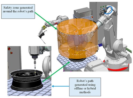 We believe that the use of a digital twin enables the quick and highly precise design of safety systems. The creation of the digital twin described in Section 4 took approximately 5 h. The most time-consuming task was setting up the laser tracker and measuring the characteristic points of the station, such as the position of the robots and the planes of the device walls, which took around 2 h. Thanks to the software used, the elements could be measured together within a common coordinate system. Another 2 h were spent modeling in the CAD system and positioning the created models relative to the points measured in reality. About 1 h was spent transferring the CAD model to the offline programming tool and building a virtual controller based on the backup of the actual station.