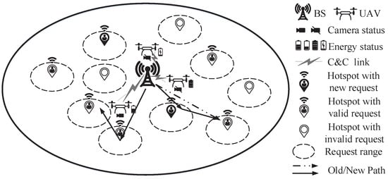 As shown in Figure 2, the requests emanating from the hotspots arrive at the BS at the end of each time slot. They are mutually independent, and share an equal priority [30]. It is supposed that the number of requests arriving in the inspection region during each time slot follows a Poisson distribution with a density of . Once a request is reported from a hotspot, the request remains valid until it is fully serviced by a UAV-UE, or until it expires due to the absence of any UAV service. Generally, these requests may emerge randomly with equal likelihood at any hotspot within each time slot.