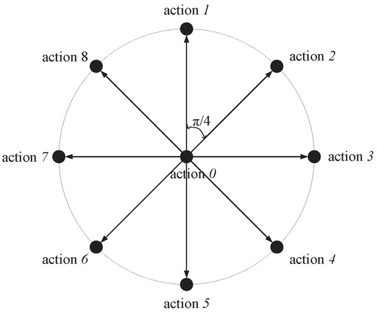With knowledge of state , the Q-agent selects an action from the set . As depicted in Figure 3, each UAV has the option to choose one of nine actions at each time slot: up, upper right, right, lower right, down, lower left, left, upper left, and hover.