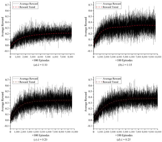 Figure 4 presents the reward outcomes achieved under varying request densities, specifically 0.1, 0.15, 0.2, and 0.25. It demonstrates the convergence of the proposed method. Notably, for any converged model, the value of can be seamlessly adjusted to simulate different scenarios or performance outcomes. For example, the learning mode of a converged model trained with can be transitioned to an application mode, and if its is changed to 0.1, the results equal the model with . Hence, the proposed method shows universality in terms of different request densities.