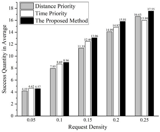 Figure 5, Figure 6 and Figure 7 illustrate the average quantities of successful service, failure, and waiting time, respectively. Based on the simulation parameters, varying request densities () correspond to an average number of requests ranging from 5 to 25.