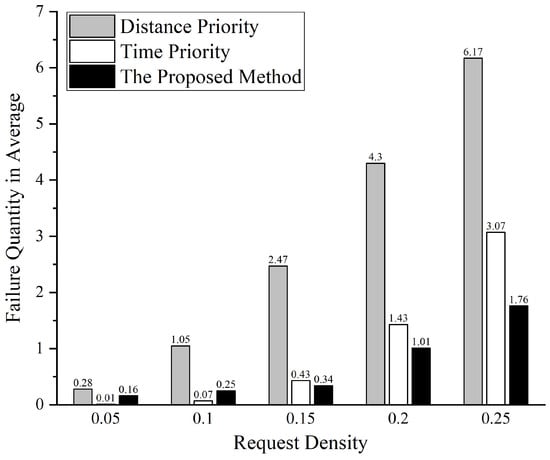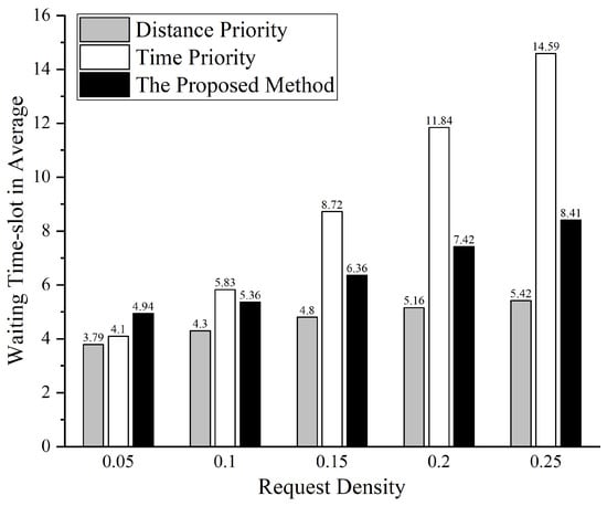 (1) Compared with the conventional time-priority and distance-priority methods, the proposed method shows one more average number of successful services and the failure is the lowest, especially under the densities from 0.1 to 0.25. Notably, even under high request densities, the average failure remains less than two, with an average request arrival of 25. The average waiting time of the proposed method is at a moderate level, which can be seen as the combination of advantages of the two baseline methods. The results indicate the effect of the proposed method.