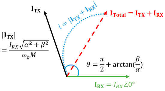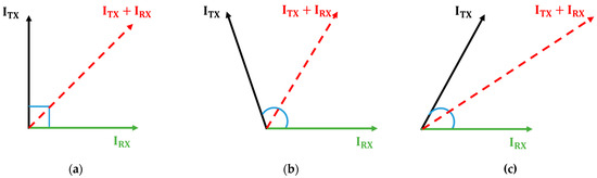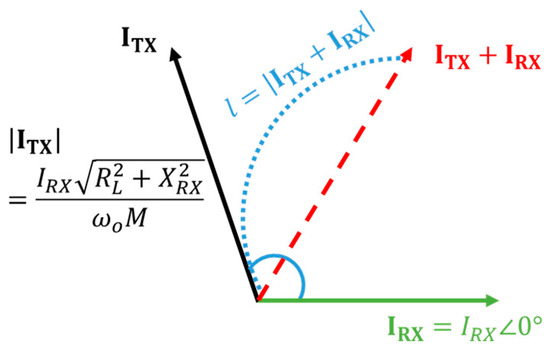According to Equation (2), to minimize the leakage magnetic field in the WPT system, the magnitude of the vector phasor sum of the TX and RX currents must be minimized. To identify the corresponding resonance condition, an analysis based on Figure 4 is conducted. In Figure 4, denotes the magnitude of the sum of the TX and RX currents, which is to be minimized. This parameter can be expressed using the law of cosines, as detailed in Equation (10).
