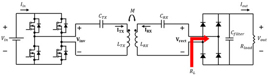 Figure 3 depicts a WPT system featuring the SS topology. In this figure, from the inverter output to the rectifier input, only the fundamental component is expressed using phasor representation. This approach, known as the fundamental harmonic approximation, has been validated in numerous studies [27]. Furthermore, given that the value of the equivalent series resistance (ESR) is generally extremely small, it is assumed to be negligible. The relationship between the direct current (DC) input applied to the WPT system and the root mean square value of the inverter output is expressed in Equation (3) [15], while the relationship between the equivalent load observed from the rectifier input on the RX and the load resistance is detailed in Equation (4) [15].
