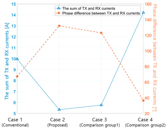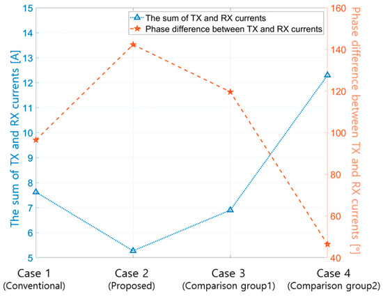 Figure 16 and Table 17 present the measured TX and RX current phase differences and current sum magnitudes for the conventional and proposed resonance capacitance determination methods in the WPT system with the double-sided LCC topology. As indicated in Table 17, when using the proposed method to determine the resonance capacitance, the magnitude of the current sum decreases by up to 46.8% compared to the conventional method. Thus, because the current value, which is the source of the magnetic field, decreases, the leakage magnetic field in the WPT system can also be inferred to decrease.
