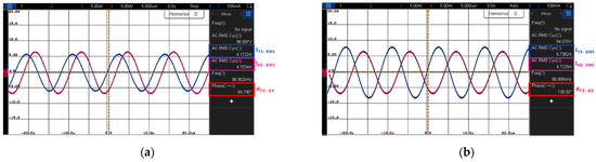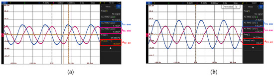 The experimental results are consistent with the predictions from the analytical equations. After applying the TX resonance capacitance derived from Equations (20) and (41), which satisfies the ZPA condition, the phase difference between voltage and current significantly decreases in the experiments, resulting in improved power transfer efficiency (as shown in Figure 14 and Figure 18). Additionally, after applying the RX resonance capacitances derived from Equations (13) and (32), the experimental results confirm a significant reduction in the leakage magnetic field (as shown in Figure 13 and Figure 17).