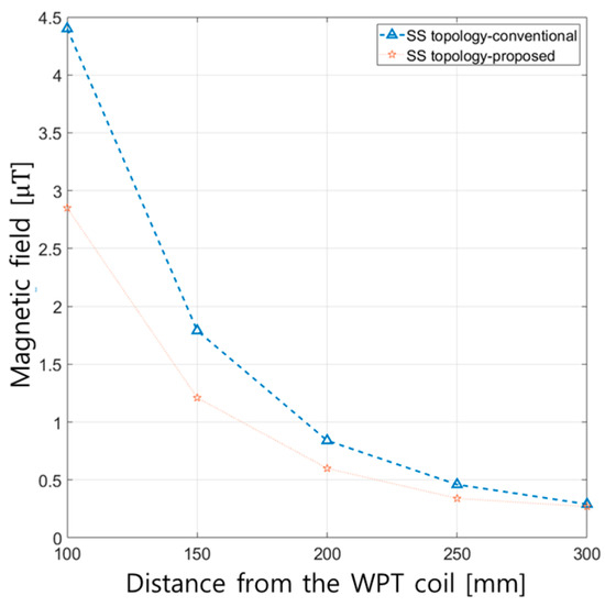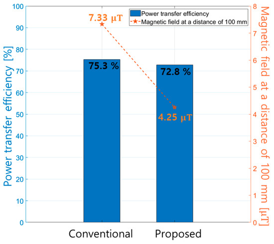Figure 13 presents the measured magnetic field as a function of the distance from the WPT coil, which is depicted in Figure 11a. As depicted, the magnetic field is measured at five different distances from the side of the coil, ranging from 100 to 300 mm, using a magnetic field meter antenna. As illustrated in Figure 13, the proposed method consistently results in lower measured magnetic fields compared to those resulting from the conventional method, regardless of the distance. Specifically, the proposed method reduces the magnetic field by varying extents, from 7% to 35%, depending on the distance. This demonstrates the effectiveness of the proposed method in reducing leakage magnetic fields.