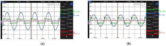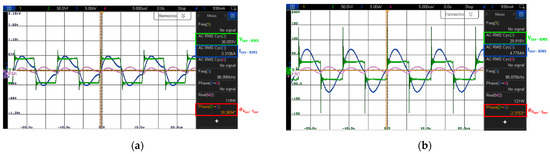Next, Figure 18 illustrates the variations in the ZPA characteristics of the WPT system with the double-sided LCC topology depending on the method used to determine the resonance capacitance. Similar to the SS topology, when the resonance of the WPT system with the double-sided LCC topology is tuned using the proposed method, the ZPA characteristics are improved compared to when the conventional method is adopted. Specifically, when the conventional method is used, the voltage–current phase difference at the inverter output reaches 18.4. Conversely, when the proposed method is adopted, the voltage and current are nearly in phase, with a phase difference of approximately −2.3.