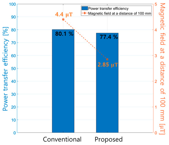 Table 15 presents the input, output, and PTE values for both the conventional and proposed methods. The abbreviations used for each voltage and current correspond to the symbols used in the circuit diagram of Figure 3. The input and output values summarized in Table 15 represent the DC input and output, respectively. While various previous studies have demonstrated that the conventional resonance method is advantageous for achieving high PTE [10], the proposed method is capable of minimizing leakage magnetic fields while also satisfying the ZPA condition. Specifically, as indicated in Table 15 and Figure 15, the proposed method achieves up to 35% reduction in magnetic field leakage, with only a 2.7% decrease in efficiency. Furthermore, given that the proposed method also helps satisfy the ZPA condition, it can be concluded to be adequately effective.