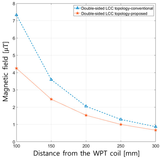 Magnetic field as a function of the distance from the WPT coil when applying the proposed and conventional methods to the WPT system with the double-sided LCC topology.