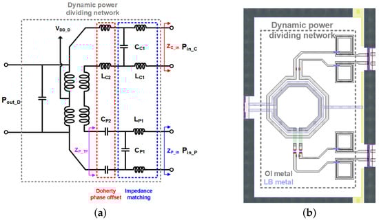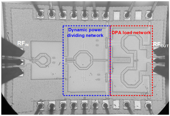 Also, the dynamic power divider makes the overall DPA more compact as it has a simplified structure with fewer transformers needed for impedance matching, compared to the conventional dual-drive topology, and it has the phase offset line merged into the impedance matching at the interstage network. For verification, the proposed DPA was designed for the targeted frequency band of 23.5–27.5 GHz and implemented with a 28 nm bulk CMOS technology. The measurement results exhibited a power gain of as high as 21.9 dB, saturated output power of 15.3 dBm, and PAEs of 26.7% and 17.6% at the peak output power and the 6 dB OBO, respectively, at the center frequency. The proposed DPA exhibited superior gain and efficiency performances at a given OBO level to the previously published CMOS DPA ICs at the mm-wave frequency band.