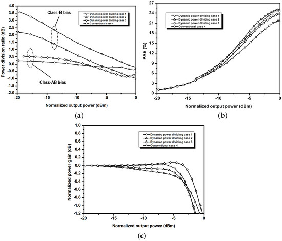 Figure 2 shows various dynamic power dividing ratios and simulated performances that were obtained from the dynamic power dividing networks with three combinations using differently optimized components compared to the conventional case using a hybrid power divider. The power dividing ratio ( P i n _ C / P i n _ P ) in Figure 2a represents the ratio of the power delivered into the carrier amplifier to the power delivered into the peaking amplifier while increasing the input power from the drive stage. Cases 1 and 2 have the peaking amplifier biased to Class-B and have the dynamic power division applied. The difference of the power ratio between the low and peak power levels is designed to be more than 3 dB for cases 1 and 2 as shown in Figure 2a. At peak power, case 1 has equal power division to the carrier and peaking amplifiers, and case 2 has 1 dB more power driven to the peaking amplifier at the peak power. Case 3 has the dynamic power division applied but has the peaking amplifier biased to Class-AB, and therefore, the variation of the power dividing ratio is low. Case 4 is the conventional case where the peaking amplifier is biased to Class-AB, and no dynamic power dividing is applied.