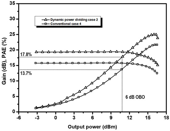 In this paper, case 2 was selected and designed for the DPA configuration. Case 2 has advantages in enhanced power gain using the large variation of the power division ratio by more than 3 dB according to the input power level and in high efficiency with the Class-B peaking amplifier. The AM-AM characteristics are maintained at an acceptable level since it has uneven power drive by about 1 dB to the peaking amplifier at the peak power level. Figure 3 presents the simulated overall gain and PAE of the proposed DPA for case 2 compared to the conventional DPA. Both cases were designed with an identical load network and a transistor configuration for the same saturated output power. Compared to the conventional case, case 2 exhibited 3.6 dB higher power gain, 4.1%p higher PAE at an OBO of 6 dB, and 3.3%p higher PAE at the peak power while maintaining good AM-AM characteristics.