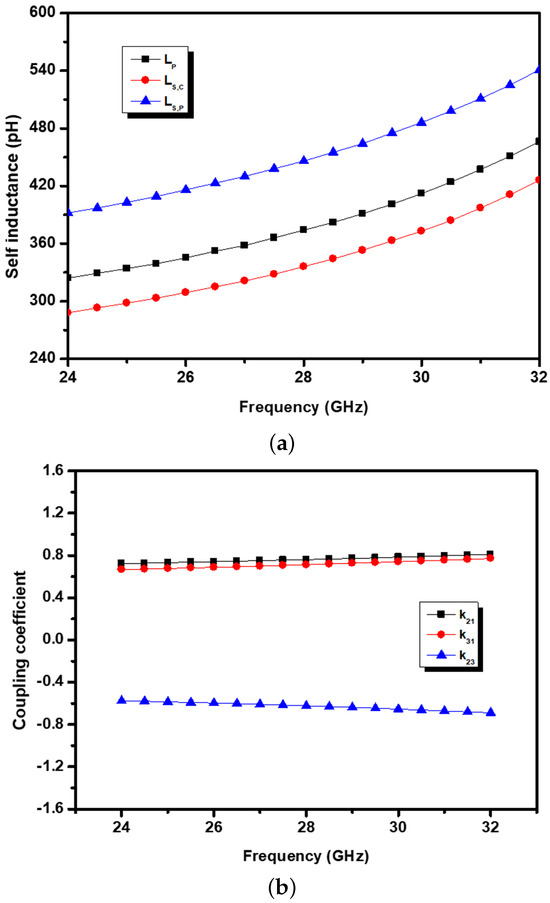 Figure 4. Design parameters of the interstage transformer: (a) Self inductance of the driver primary turn, carrier path secondary turn, and peaking path secondary turn; (b) Coupling coefficients.