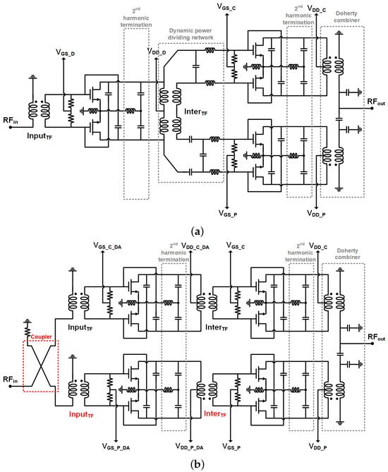 Figure 7. Full schematics of the DPAs with the following: (a) The proposed dynamic power dividing network; (b) A conventional dual-driven DPA using a hybrid coupler.