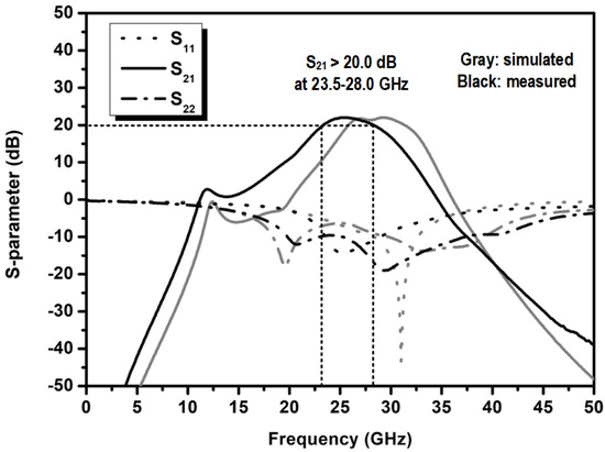 Figure 8 shows the photograph of the fabricated DPA IC using Samsung’s 28 nm bulk CMOS technology. The DPA IC has an active area of 0.55 mm2 and was evaluated by probing after chip-on-board (CoB) assembly. Figure 9 presents the simulated and measured small-signal characteristics of the proposed DPA. The small-signal measurements showed a gain of higher than 20 dB at the frequency band of 23.5–27.5 GHz.