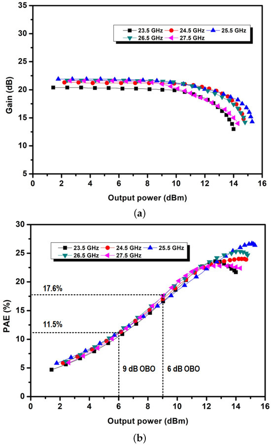 Figure 10 shows the measurement results using a continuous wave (CW) signal for the frequency range of 23.5–27.5 GHz. Figure 10a shows the measured power gain according to the output power, which shows saturated output power of 14.0–15.2 dBm at the targeted frequency band. Figure 10b presents the measured PAE performances, which are 22.8–26.7% at the peak output power and 14.6–17.6% at the 6 dB OBO. The measured CW performances show good agreement with the simulated results presented in Figure 3.