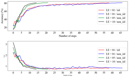 Figure 6 shows the analysis of the learning performance based on local epochs (LEs) and data distribution (IID and non-IID). Across all the experimental settings, the accuracy consistently increased with the number of learning steps, eventually converging to approximately 80%. In the non-IID settings with higher LE values (LE = 10/non-IID and LE = 05/non-IID), the accuracy increased more rapidly and converged earlier. By contrast, settings with lower LE values, such as LE = 01/IID and LE = 01/non-IID, exhibited a slower increase in accuracy and required more steps to achieve convergence.