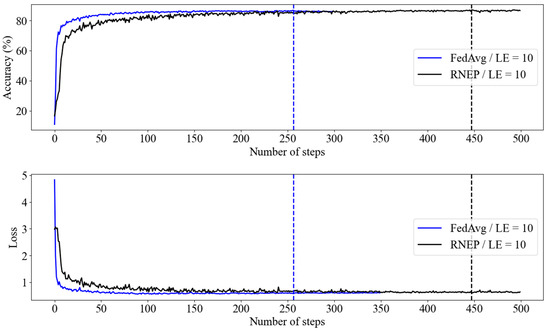 The vertical lines indicate the convergence points of each algorithm. The FedAvg algorithm shows a rapid decline in loss and a swift increase in accuracy during the initial learning phase, achieving relatively quick stability. In contrast, the RNEP algorithm exhibited greater variability in the early stages, with the loss gradually decreasing. However, it eventually reached levels of accuracy and loss similar to those of FedAvg. Both algorithms converged to comparable points, with RNEP continuing to reduce loss over time despite initial fluctuations. These results suggest that RNEP can achieve performance stability on par with that of FedAvg.
