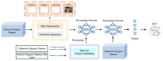 This section provides an introduction to the semi-supervised open-set modulation recognition approach, with a detailed description of the specific structure and training methods of each component of the proposed SOAMC. The adaptive enhancement module uses modulated signal flipping, rotation, noise addition, and CutMix algorithms for data enhancement, and incorporates adaptive adjustment of confidence thresholds to improve the performance of pre-trained modulated signal recognition networks. The open-set features are embedded in the fine tuning network, which is used to extract features and feed them into the graph neural network for label propagation. It is capable of refined classification of unknown samples in cases where there are very few unknown samples by manual labeling. The structure of SOAMC is shown in Figure 1.