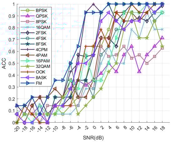 Figure 4a,b depict the recognition accuracy of each modulation mode at various signal-to-noise ratios. A comparison of the two figures reveals that SOAMC demonstrates significant enhancements for the challenging modulation types of WBFM and 16QAM.