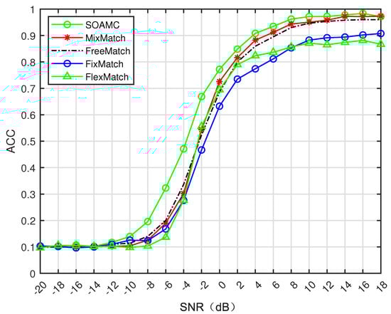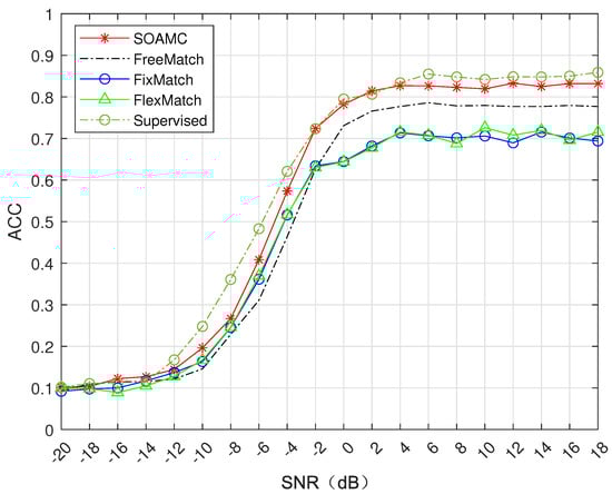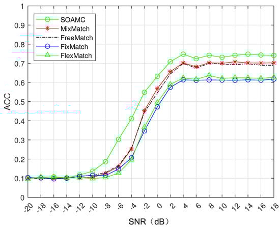 It can be seen from Figure 3 that the recognition accuracy of the FlexMatch algorithm and the FixMatch algorithm is low, especially after 0 dB, and the FlexMatch algorithm and the FixMatch algorithm show a lower recognition rate. The recognition rate of the FreeMatch algorithm is higher than that of the FlexMatch algorithm and the FixMatch algorithm. It can be seen that the FreeMatch adaptive threshold adjustment and adaptive fair regularization multiplication are effective for modulated signal data. The accuracy of the proposed SOAMC algorithm in low SNR and high SNR is significantly higher than that of the FreeMatch algorithm, and it is close to the fully supervised algorithm, which shows the effectiveness of the proposed SOAMC algorithm.