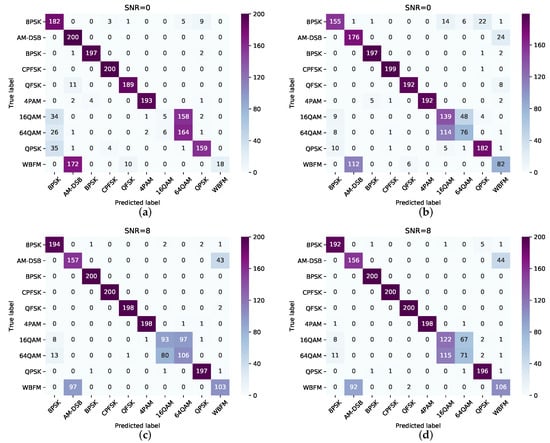 Comparison of results between SOAMC and FreeMatch split on 0 dB and 8 dB on the confusion matrix. (a) FreeMatch—0 dB. (b) SOAMC—0 dB. (c) FreeMatch—8 dB. (d) SOAMC—8 dB.