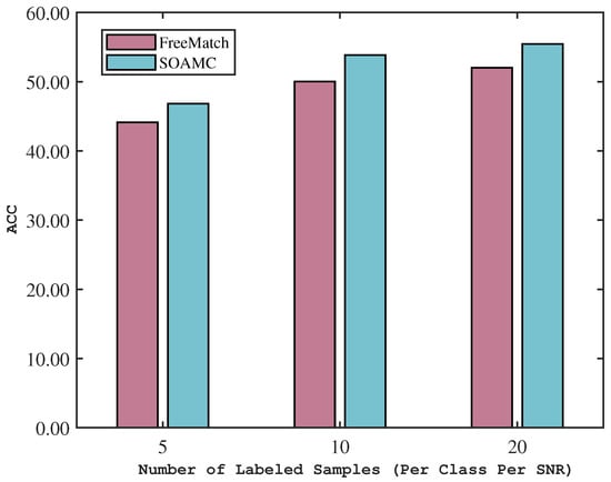Figure 6 illustrates a comparison of the recognition rates between FreeMatch and the proposed SOAMC algorithm across varying numbers of labeled samples. When faced with severely limited labeled data, specifically five labeled samples per class per signal-to-noise ratio, the SOAMC method demonstrates a 2% increase in accuracy compared to the FreeMatch approach. Moreover, with only 10 and 20 labeled samples per class per SNR, the SOAMC algorithm exhibits enhanced recognition performance, showcasing accuracy improvements of 4% and 3% over the FreeMatch method, respectively. These results unequivocally establish the superior performance of the proposed method over the FreeMatch technique in scenarios with scarce amounts of labeled data.