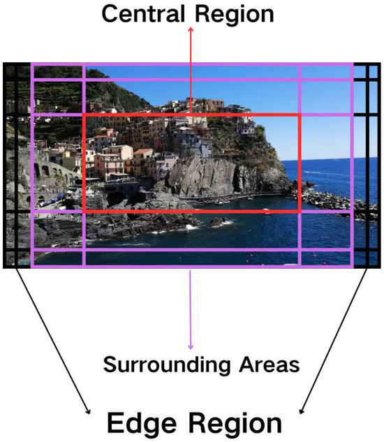 Each video segment is further divided into three regions, denoted by . Here, represents the central region, the primary focus of the user’s field of view; covers the surrounding areas; and corresponds to the edge region, which attracts the least user attention. Each region is non-uniformly encoded into non-overlapping rectangular blocks of varying sizes known as tiles, denoted by , , and .