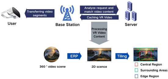 The 360° video content is pre-cached at the base station based on the algorithm proposed in this paper. Consider a video library I containing a set of 360° videos with cardinality . Each 360° video V in the video library is evenly divided into n segments, each of equal duration, denoted by , where represents the i-th segment of video V. As illustrated in Figure 2, this study adopts the equirectangular projection (ERP) format, which is widely used for 360° video, to project the spherical 3D content onto a 2D rectangular plane [37].
