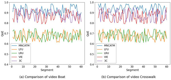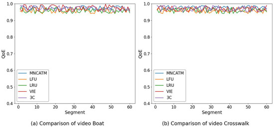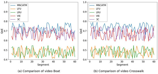 In Figure 3, the QoE performance of the MNCATM algorithm is evaluated under normal network bandwidth conditions. The results demonstrate that the five algorithms exhibit similar trends across both video samples, with the QoE values of each algorithm fluctuating throughout the transmission process. Among them, MNCATM consistently outperforms the others, delivering higher QoE and exhibiting less fluctuation. The QoE for MNCATM predominantly remains within the range of 0.86–0.99, indicating its superior ability to provide an optimal user experience. In contrast, the QoE values for the LRU and LFU algorithms show significant fluctuations and are notably lower than those of the other three algorithms, with maximum QoE values reaching only up to 0.75. The QoE performance of the 3C and VIE algorithms is comparatively better, with QoE values fluctuating between 0.79 and 0.95, positioning them as the second best after MNCATM.