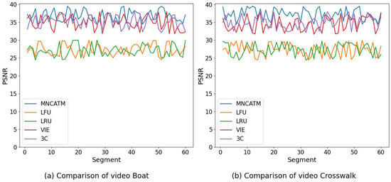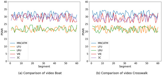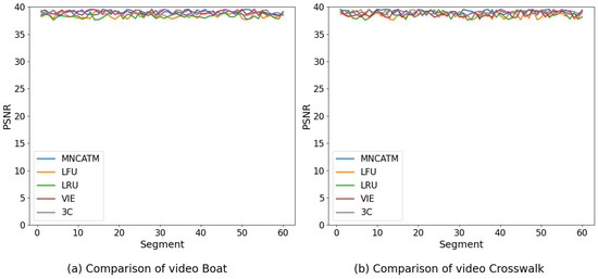 Figure 6 shows the evaluation results of the PSNR performance of the five algorithms when applied to the two videos of a boat and a crosswalk under normal bandwidth. A higher PSNR value indicates better image quality. Across all video clips, MNCATM maintains a PSNR generally within the range of 35–40. While there are some fluctuations, they are relatively minor, allowing MNCATM to deliver consistently high visual quality in most clips. In contrast, the PSNR values for the LFU and LRU algorithms are notably lower than those of the other three algorithms, typically ranging between 25 and 30, with some instances where the PSNR dips even lower and exhibits considerable fluctuations. The PSNR performance of the 3C and VIE algorithms is closer to that of MNCATM, with both occasionally matching MNCATM’s performance, particularly in certain clips. However, these algorithms also experience occasional large fluctuations in PSNR.