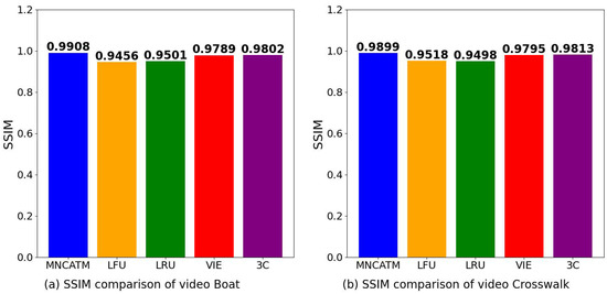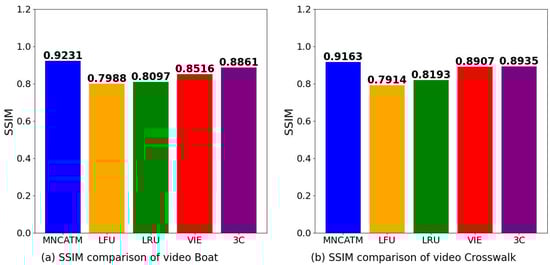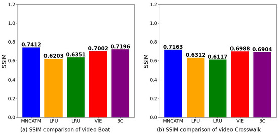 Figure 9 illustrates the results of SSIM, which evaluates the quality of an image or video when the network bandwidth is normal. An SSIM value closer to 1 indicates a higher similarity between the reconstructed video and the original, signifying superior video quality. As observed in the bar graph, the SSIM value for MNCATM exceeds 0.9 in both videos, which is substantially higher than that of the other algorithms, indicating exceptionally high video quality.