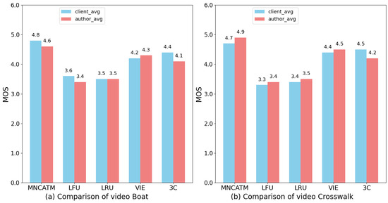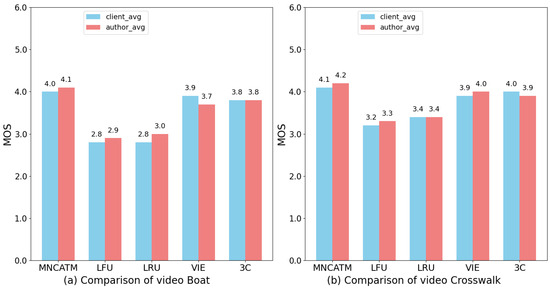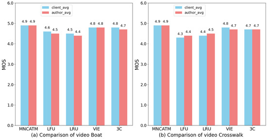 To assess the impact of 360-degree VR video quality on user subjective experiences under different conditions, we designed an MOS evaluation experiment, as depicted in Figure 12, Figure 13 and Figure 14. Based on the MOS standard specified by the International Telecommunication Union (ITU), we recruited 30 participants, equally divided between men and women, aged between 15 and 60 years old and free of vision-related diseases [38]. All participants had experience watching VR videos and were arranged to watch the videos in the same environment to minimize the impact of external factors (such as light, equipment quality, etc.). Under three conditions of good, average, and poor network bandwidth, the participants were asked to watch two videos, “Boat” and “Crosswalk”, under five different transmission schemes, namely LFU, LRU, VIE, 3C, and MNCATM. We distributed rating sheets to 30 users and asked them to rate the video quality of each solution from 1 to 5 in three scenarios to ensure the validity of the ratings. Finally, for the two 360-degree videos, the arithmetic average of the 30 user ratings for each solution in each case (client_avg) was calculated. In addition, we also participated in the experiment and provided scores to calculate the arithmetic average of the author ratings (author_avg) under the same conditions.