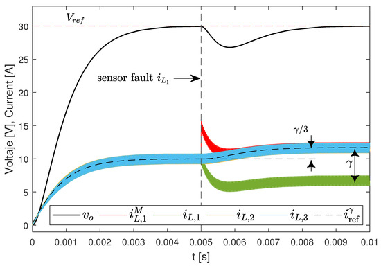 In a first analysis, the converter control is assumed to be only current based, i.e., , where is a constant, and the current sensor in the phase k experiences a failure or disturbance . Therefore, in sliding mode, , and in the event of a sensor failure, the current flowing through the inductor will be