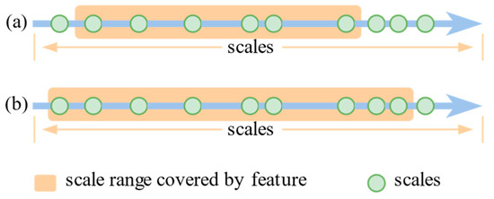 Figure 1. (a) is the receptive field coverage of YOLOF’s original method, which can cover features at multiple scales; (b) is the improved method, which further expands on YOLOF’s original coverage and improves on both small and large objects.