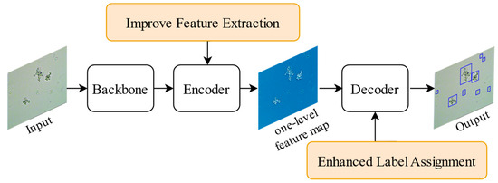 To address the challenges faced by single-stage feature detectors in capturing objects at different scales, this study optimizes the detection performance of YOLOF. By integrating a parallel deformable convolution module into the output encoder, the detector can dynamically adjust the sensory field size to more efficiently adapt to the diversity of object morphologies and poses in the image, facilitating the capture of multi-scale feature information. Additionally, more accurate label assignment is achieved through improvements based on the quality of positive samples. The enhanced quality of the positive samples provides the model with better learning objectives. Together, these improvements significantly enhance the performance of the detector. A process map of the method is shown in Figure 2.