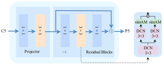 Diagrammatic representation of the dilated encoder structure. C5 is the input feature, and P5 is the output feature. The label 3 × 3 represents the dilated convolution, SimAM is the parameter-free attention, and DCN is the deformable convolution.