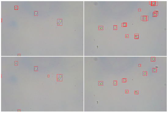 We plotted loss curves to analyze the training process. As shown in Figure 8, the regression loss of this paper’s method is much lower than that of YOLOF when the input images are the same, and the classification loss of Dq-YOLOF decreases faster at the beginning, which may mean that it learns faster at this stage. The main reason for this is that the urinary sediment data are mainly small and medium objects and only a few are large objects. Since the classification loss reaches a better result at 20,000 iterations, a line graph of the data between 0 and 20,000 is shown. It can be seen that both the classification loss of Dq-YOLOF and the classification loss of YOLOF converge to very small values in the end, but Dq-YOLOF is a little faster. This indicates that the model converges faster and is more accurate. Based on these curves, we can conclude that the Dq-YOLOF model shows faster learning speed in training both in classification and regression tasks, which indicates that it is more efficient compared to YOLOF.