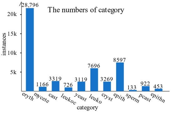 To validate the performance of Dq-YOLOF against morphologically diverse objects, we decided to test it on a urinary sediment dataset containing images from the Hefei Institute of Physical Sciences, Chinese Academy of Sciences. We primarily screened the dataset and selected images with better annotation quality and clarity for retention. The dataset mainly includes 11 components: erythrocytes (Eryth), leukocytes (Leuko), leukocyte clusters (Leukoc), squamous epithelial cells (Epith), non-squamous epithelial cells (Epithn), clear tubular (Cast), pathological tubular (Pcast), spermatozoa (Sperm), yeasts (Yeast), molds (Mycete), and crystals (Cryst). Hence, it is named Urised11.