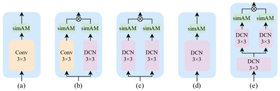 Five structures compared with the original method, where (a) is the original method, Conv stands for dilated convolution, DCN stands for deformable convolution, and simAM stands for parameter-free attention. (b) employs parallel dilated convolution and deformable convolution, followed by a simAM module in series after each convolution. (c) replaces the dilated convolution in (b) with deformable convolution. (d) replaces the dilated convolution in a with deformable convolution. (e) combines both (c,d).