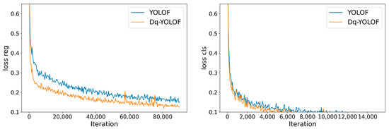 Loss curves for YOLOF and Dq-YOLOF. The left is the regression loss and the right is the classification loss.
