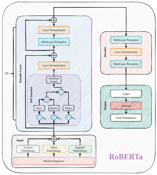 RoBERTa (Robustly Optimized Bidirectional Encoder Representations from Transformers Pre-training Approach) [31] is an NLP model that is built upon a variant of the transformer architecture [32] and is specifically designed to handle language comprehension tasks. Its layout is depicted in Figure 1. The key objective of the RoBERTa model is to improve the pre-training process in order to effectively leverage large-scale unlabeled text data for model training. Compared to the earlier BERT [33], RoBERTa incorporates a larger model size and a longer training time while introducing several technical improvements such as dynamic masks, continuous text paragraph training, and larger batch sizes.