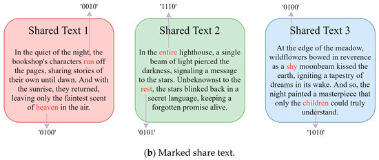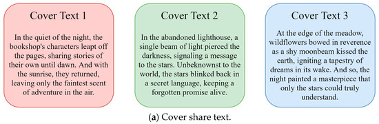 An example of (2, 3)-linguistic secret sharing is provided. Suppose the original secret data are an 8 bit binary random bitstream “11010011”; after secret sharing, three shared bitstreams “00100100”, “11100101”, and “01001010” are generated. Three cover texts and their corresponding text shares are shown in Figure 5a and Figure 5b, respectively. It is noteworthy that each sentence within the share text is capable of being embedded as 4 bit shared data when the number of candidate pools of each selected token is set to 16. During the secret recovery process, the ambiguous token within each sentence can be easily identified through the proposed token selection algorithm. Subsequently, the shared data can be extracted according to the order of selected tokens in the candidate pool. Following this step, any two out of three shared data can be combined to recover the original secret bitstream.